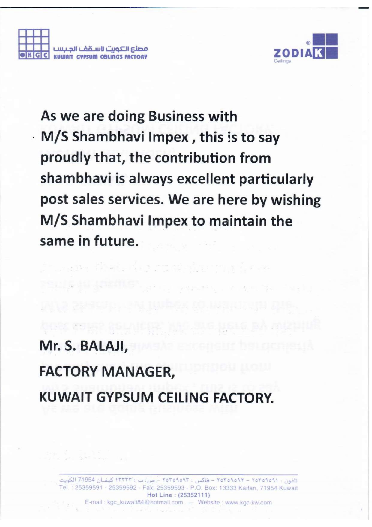 Mr. S. Balaji, Factory Manager, Kuwait Gypsum Ceiling Factory
